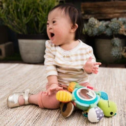 Wat zal jouw kleine zich vermaken met deze schattige schildpad van Infantino. Dit schildpadje is voorzien van verschillende kleurtjes, stofjes en texturen om de tastzin van je kindje te stimuleren. Daarnaast heeft hij een spiegeltje in zijn buikje zodat jouw kleine leert zichzelf te herkennen en voor een leuk kiekeboe effect!